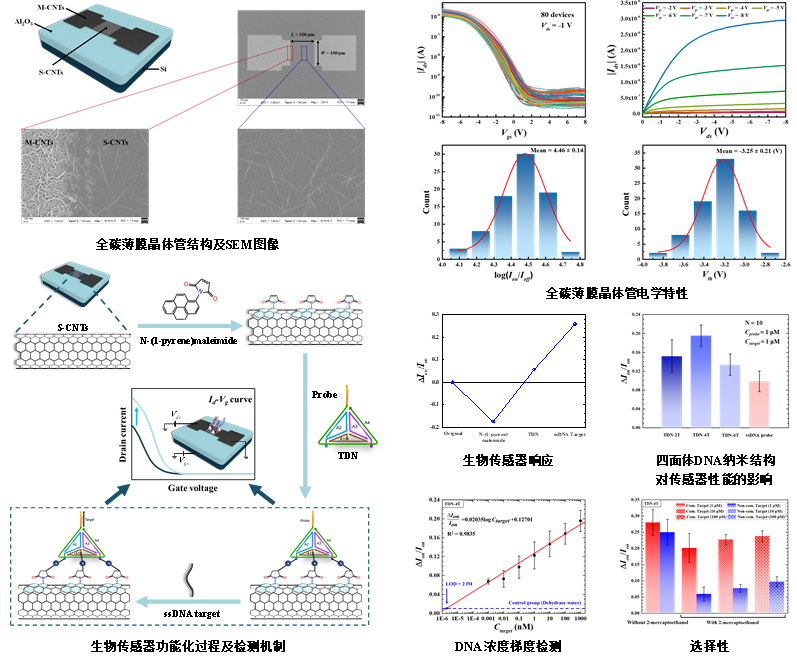信息pc28开奖预测 张敏副教授课题组和化生pc28开奖预测 李子刚教授/尹丰研究员课题组首次将全碳纳米管薄膜晶体管(all-carbon nanotube thin-film transistor,all-CNT TFT)生物传感器与四面体DNA纳米结构(tetrahedral DNA nanostructures,TDNs)相结合,实现了对三阴性乳腺癌标志物AKT2基因的检测。与传统单链DNA探针相比,采用TDNs的all-CNT TFT生物传感器可实现高达98%的响应提升。该生物传感器实现了具有高选择性和高可重复性的DNA检测,其线性检测范围达到六个数量级,理论检测限可达2fM。该研究提出的all-CNT TFT生物传感器结合TDNs的平台有望实现多种癌症标志物的同时捕获,为临床检测提供一种简单、有效、高性能的通用“液体活检”策略。