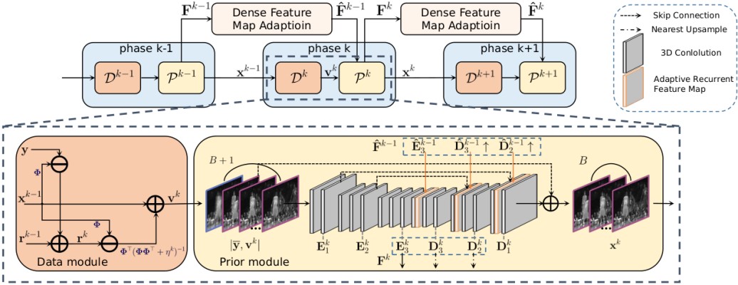 “Dense Deep Unfolding Network with 3D-CNN Prior for Snapshot Compressive Sensing”研究的内容是可解释性网络在视频压缩感知上的应用。视频压缩感知被广泛地应用在成像系统上,其目的是利用二维传感器来捕捉诸如视频亦或是光谱等高维信号。通过在成像系统中引入额外的硬件部件,高维信号被压缩成二维信号,随后运用重建算法完成二维信号到高维信号的重建,通过此类硬件加软件的形式,能够减少数据的存储空间和传输带宽。然而,现有的方法均存在一定的局限性,基于模型的方法需要迭代多次才能收敛,在速度上无法满足实时性,基于网络的方法又缺乏一定的可解释性,pc28开奖预测张健教授课题组的研究表明,基于深度展开的方法能够很好地利用两种方法的优势。该研究结果所设计的深度展开网络由优化压缩感知的半二次分裂算法(HQS)展开而成,深度展开网络的网络结构由数据模块和先验模块交替堆叠而成,其中引入3D卷积来提升深度展开网络对帧间相关性的表征能力;以及使用稠密特征融合技术减少信息在不同阶段之间传递引起的损失,以及帮助信息自适应地在不同阶段中传输。网络结构如下图所示: