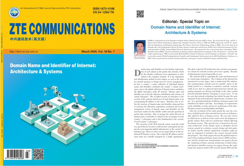 《ZTE COMMUNICATIONS》主要刊载通信领域最新发展方向的行业与技术相关综合论文,读者群为海外行业高管,高等院校、科研院所及电信运营商的科研人员。《ZTE COMMUNICATIONS》作为中兴通讯技术的英文版全球发行,具有很大的国际影响力。这次出版的刊物中,行内领军领先企业和高校一起为大家带来了互联网中域名与标识相关的前沿动态与技术。