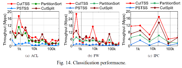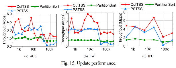 CutTSS算法的规则更新性能与Open vSwitch中所采用的PSTSS元组算法相当,但在流表查找性能上却比PSTSS算法提升了接近一个数量级。
