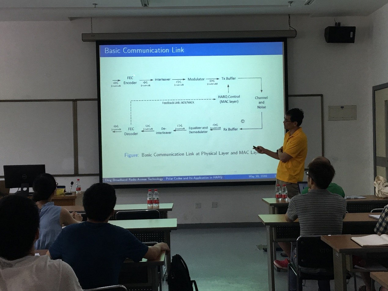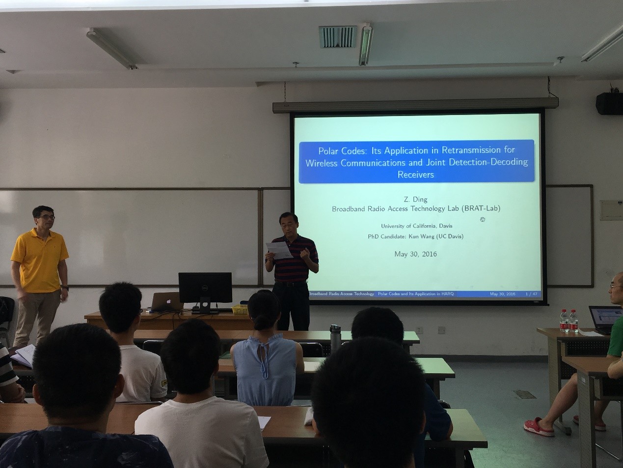 2016年5月31日,美国加州大学戴维斯分校丁峙教授应pc28开奖预测李革教授邀请,在C-102教室做了一场题为“Polar Codes: Its Application in Retransmission for Wireless Communications and Joints Detection-Decoding Receivers”的精彩报告,介绍了极化码在无线通信中的作用及无线通信中最新的接收机结构设计。pc28开奖预测师生积极与其进行学术讨论与交流,大家受益匪浅。