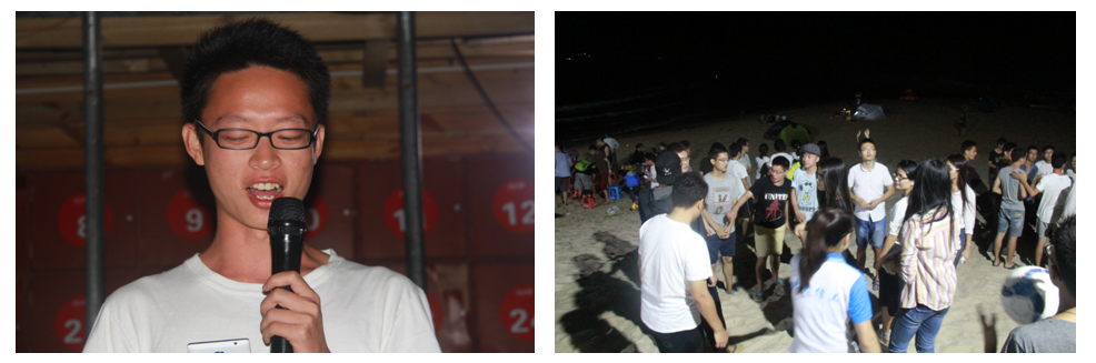 入夜后就是文娱晚会时刻,几首歌曲后将现场气氛引向高潮,同学们纷纷到沙滩上进行躲避球大战和踩气球竞争,获胜的同学还拿到了研会精心准备的礼品,笑声、欢呼声传遍了西冲海岸。