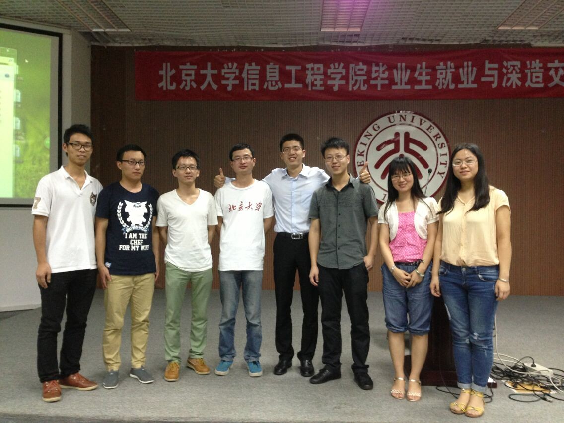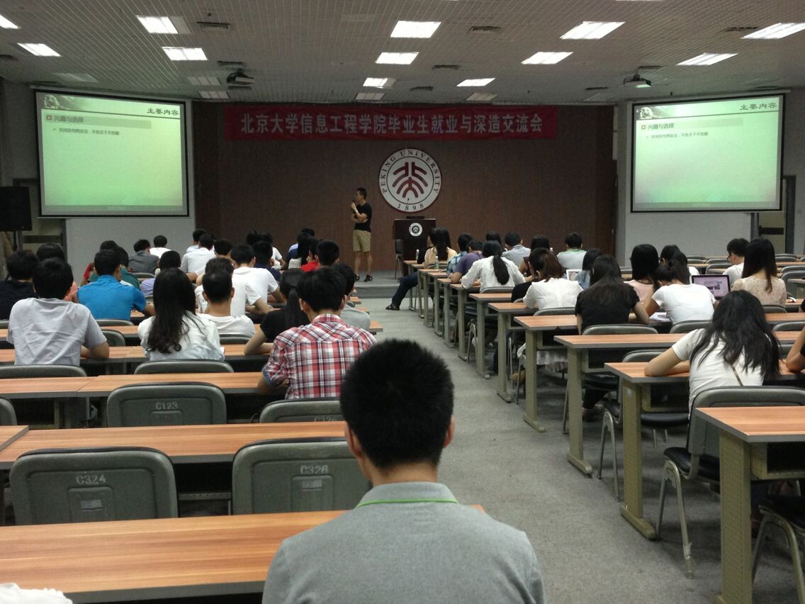 对就业与深造经验交流工作的支持,也感谢了几位师兄的倾力加盟,之后宣布交流会正式开始。第一位进行经验介绍的是来自刘宏教授实验室的张结同学。张结同学有着丰富的博士申请经验,曾成功获得荷兰代尔夫特大学、英国帝国理工大学等攻读博士学位的机会,他主要为同学们介绍了留学所需要准备的材料,还与同学们分享了准备留学与学校选择时的心路历程,他最终选择到代尔夫特大学攻读博士学位。第二位进行经验介绍的是来自王新安教授实验室的杨乐同学。杨乐同学的演讲主题是“选择与就业”,他告诉我们一种选择决定一种生活,要遵循内心的声音。接下来演讲的是计算机专业的彭祎同学。彭祎同学的毕业去向是百度,他的演讲方式轻松幽默,让在场的同学获得了非常愉悦的听觉体验。随后,来自微电子专业的岳仑仑同学的毕业去向是华为,他以自己求职面试的亲身经历给大家提出了一些自己的求职小建议。第五位进行经验介绍的是来自计算机专业的陈艺勇同学。陈艺勇同学有着丰富的互联网公司求职经验,曾成功获得阿里巴巴、WAP、宜信等公司的入职机会,最终根据自己个人情况选择了宜信大数据方向的工作。接下来演讲的是微电子专业的杜虓同学,他的毕业去向是东方证券,他以自己的亲身经历告诉我们换专业并不难,我们信工的学生同样可以从事金融证券方面的工作。随后,来自计算机专业的李旭峰同学为大家讲述了自己应聘央行的经历,并分享了一些国企、央企、事业单位的求职经验。最后一位是来自张盛东教授实验室的谢磊同学,他从简历制作到面试笔试都为同学们做了细致的分析与经验分享。