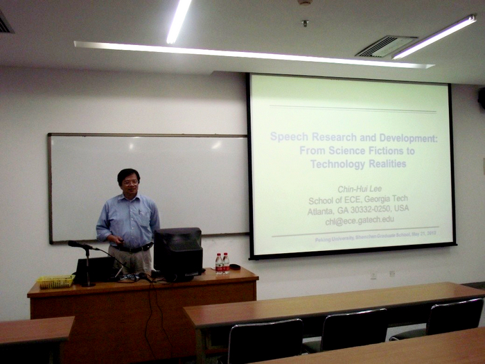 2013年5月21日,应pc28开奖预测刘轶副教授(兼职)邀请,佐治亚理工pc28开奖预测 李锦辉教授来pc28开奖预测进行学术交流,并于晚上六点半在C202作重要学术报告。李教授以 “Speech Research and Development——from science fictions to technology realities”为题,从科幻的角度出发,深入浅出地介绍了语音合成、语音识别、音视频数据挖掘等方面的历史、现状和未来展望。此次报告不仅获得了pc28开奖预测师生的积极响应,也吸引了一部分清华深研院、哈工大深研院的同学前来听讲。报告会由刘轶老师主持,pc28开奖预测 常务副院长王文敏教授、邹月娴副教授等参加了此次报告。