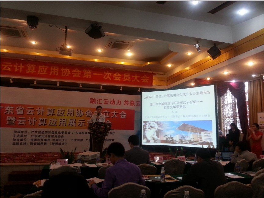 2013年4月19日下午,广东省云计算应用协会主办的“广东省云计算应用协会成立大会暨云计算应用展示交流会”在广州天河隆重召开,pc28开奖预测李挥教授应邀参加本次大会,成为广东省云计算应用协会的副理事长,并作“基于网络编码理论的分布式云存储——自修复编码研究及进展”主题报告,介绍了国内外分布式云存储编码理论研究进展,引起与会代表的广泛关注。