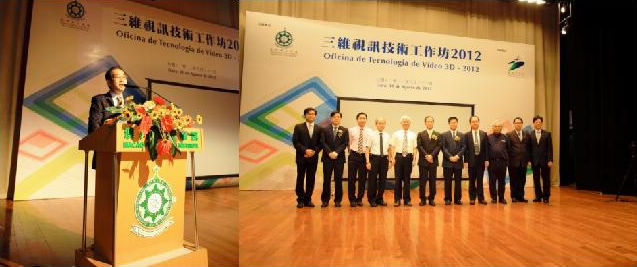 常务副院长王文敏教授、董胜富工程师一行于8月31日参加了澳门3D视频技术研讨会(3D Video Technology Workshop 2012),王文敏教授做了“数字视频编解码标准AVS现状及进展”的主题报告,介绍了具有我国自主知识产权的数字音视频编解码技术标准AVS、AVS+的核心技术、现状、进展及其产业化成果,并展示了由北大数字视频编解码技术国家工程实验室、北大深研院数字媒体研究中心、数字视频编解码技术国家工程实验室广州研发中心研制的AVS 3D高清实时采编播系统。