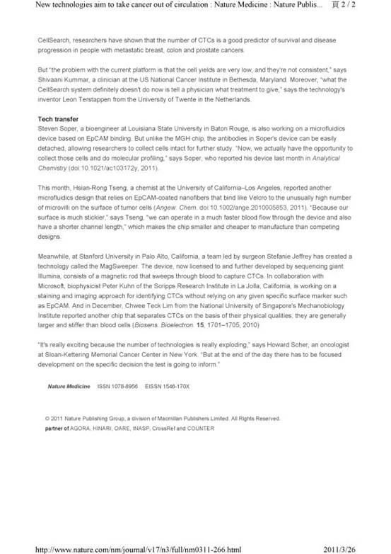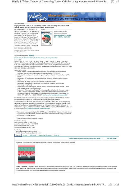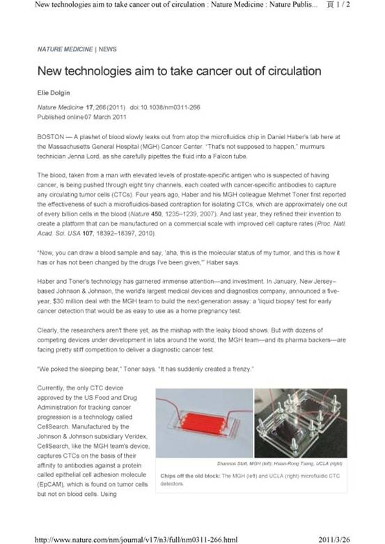 近日,pc28开奖预测新聘的兼职教授的李贻昆教授(来自香港科技大学,是美国加州大学博士UCLA)及其科研小组研发的MEMS微机电生物测癌芯片microfluidic CTC chip paper for early cancer diagnostics已被刊登国际医学权威期刊封面,并被国际权威医学杂志medical Nature 3/21期报导,此荣誉与诺贝尔奖相当。