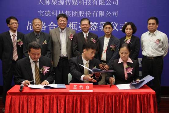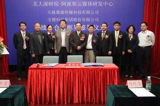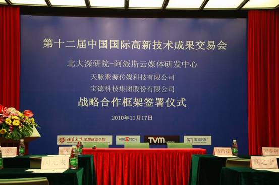 2010年11月17日下午,北京大学深圳研究生院“深圳市云计算关键技术与应用重点实验室(组建)”、“北京大学深圳研究生研院—阿派斯云媒体研发中心” 在第十二届中国国际高新技术成果交易会场馆五楼玫瑰一厅举行了与无锡天脉聚源科技有限公司、深圳宝德科技集团有限公司和北京天亚科创软件有限公司战略框架合作协议的签署仪式。签约各方就积极响应深圳互联网产业振兴发展规划(2009—2015年)【深府〔2009〕237号】,在云计算、云媒体、三网融合相关领域联合开展“政、产、学、研、用”的科技创新模式达成了积极、友好的战略合作意向。本次签约仪式得到了《大公报》、《南方日报》、《南方论刊》,“主流财富网”,“E800”等多家媒体和网站的现场采访和追踪报道。