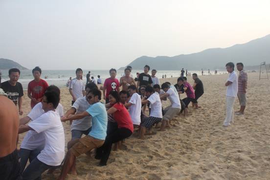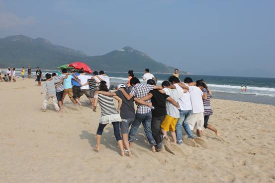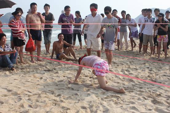 下午是素质拓展类游戏时间。首先进行的是“绑腿跑”游戏,每队由8人参加,队内所有人用布条绑腿,哨子声起,所有人开始朝终点跑,全程30m,用时最少的队胜出。