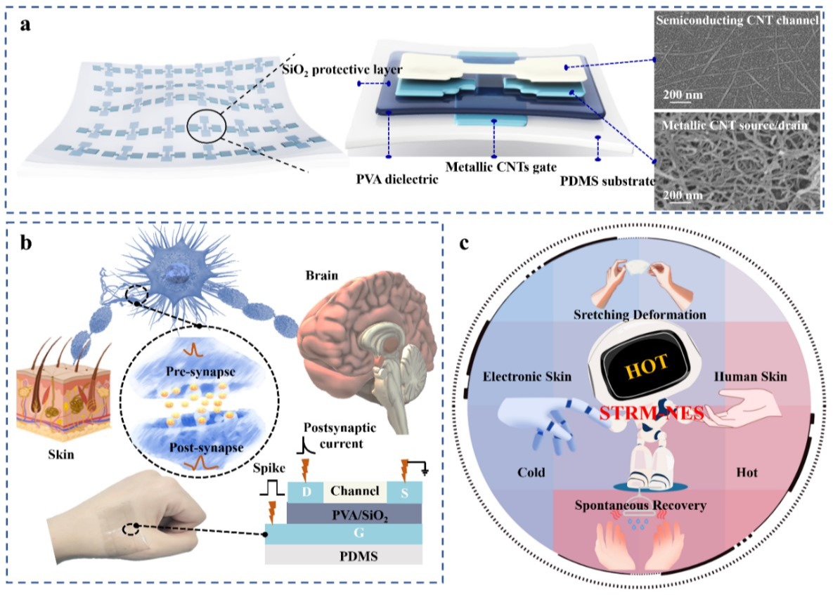 该研究提出并实现了基于碳纳米管沟道及电极,基于PVA介电层的可拉伸温度响应多模态神经形态电子皮肤。其阵列能够同时或独立通过温度和拉伸形变来调制神经形态特性,并且集传感、识别、存储、自愈合等功能于一体。该STRM-NES可以高效、高灵敏度地、长期监测和记忆温度或应力的变化,实时原位监测个体和外部环境信息。此外,该STRM-NES还具有出色的自愈合能力和可重复使用性,表现出与人类皮肤相似的感知、传递、记忆、自愈合特性,为未来可穿戴电子设备、智能机器人、皮肤假肢修复等应用提供了新的可能性。