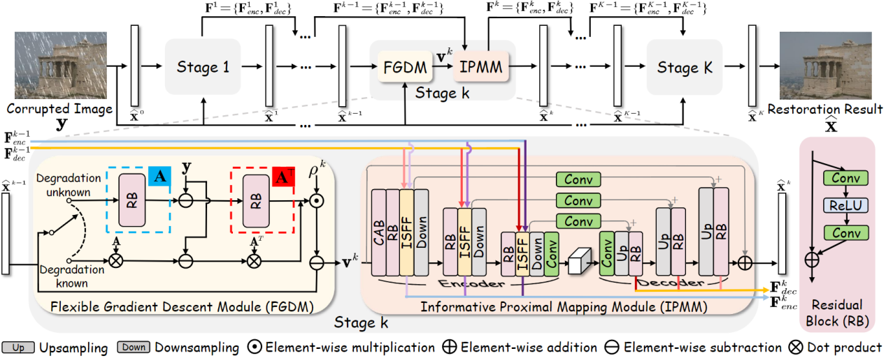 自然图像重建具有广泛的应用价值,可以显著提升图像或视频的视觉质量。现有图像重建方法在性能和模型可解释性上都存在一定的缺陷。论文“Deep Generalized Unfolding Networks for Image Restoration”针对现有的缺陷研究了可解释性网络在自然图像重建上的应用。研究表明,优化启发式的网络设计在提升模型可解释性的同时也可以提升模型性能。如图3所示,论文设计的新型深度展开网络由近端梯度下降算法(PGD)展开而成,每个阶段的网络结构由数据模块和先验模块交替堆叠而成,其中引入级间跳跃连接来个改进传统算法中存在的信息损失。通过可学习模块替换传统算子,所设计的模型具有良好的自适应能力,同时保持了良好的可解释性,在多个自然图像重建任务中取得了领先性能。该工作由课题组独立完成,论文通讯作者为张健助理教授,pc28开奖预测 为第一作者单位,牟冲同学为第一作者,论文合作者还包括课题组的王茜同学。