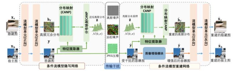 图像隐写术(Image Steganography)旨在隐秘地将隐藏信息嵌入到一张与宿主图像近似的容器图中。此前的隐写方案通常将隐写和重建视为两部分网络进行构建,难以同时保证可靠的重建质量和隐秘性;现有技术对网络传输中的噪声和压缩也相当敏感,容器图上轻微的干扰即可能影响重建质量。如图1所示,论文“Robust Invertible Image Steganography”提出了一种可逆图像隐写方法,通过设计条件标准化流模型(Conditional Normalizing Flow),将图像的隐写和解密视作一对逆问题加以联合高效求解。为了提升隐写容量和重构质量,论文提出了分布映射模块,能够给重建过程提供有效引导,从而保留隐藏图的更多高频信息。同时,在端到端训练中引入了对各类失真的模拟,在重建网络中设计了图像增强模块以提升鲁棒性。综上,论文构建了一个强鲁棒性的高效图像隐写框架,在水印鉴权、换脸检测、屏显隐藏图像等方面有着广泛应用。该工作由课题组独立完成,论文通讯作者为张健助理教授,pc28开奖预测 为第一作者单位,许佑民同学为第一作者,合作者还包括课题组的牟冲同学、胡妤婕同学、谢静芬同学。