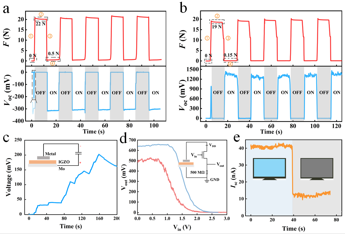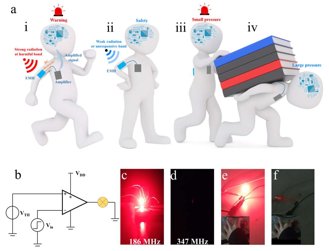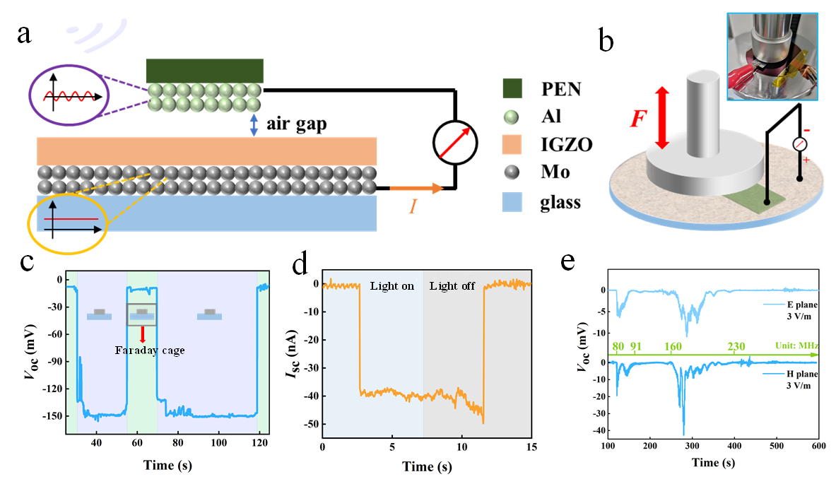该工作首次提出,基于范德华接触异质结的摩擦伏特直流发电机和单异质结整流天线的器件结构相似,因此摩擦伏特直流发电机在准静态条件下会吸收环境中的电磁能量。由于异质结电学特性受压力调控,范德华接触异质结作为电磁能收集器可以在外界压力控制下实现“开关”状态的切换。该工作所提出的设计和机理具有普遍性,并已在基于不同材料和结构制备的器件中得到验证。该电磁能收集器可直接为电容器充电、点亮LED、为低功耗反相器供电以及作为双模传感器实时探测外界电磁辐射和压力。该研究提出的机械可调的电磁能收集器在可穿戴电子设备、智能机器人和物联网等领域具有应用潜力。