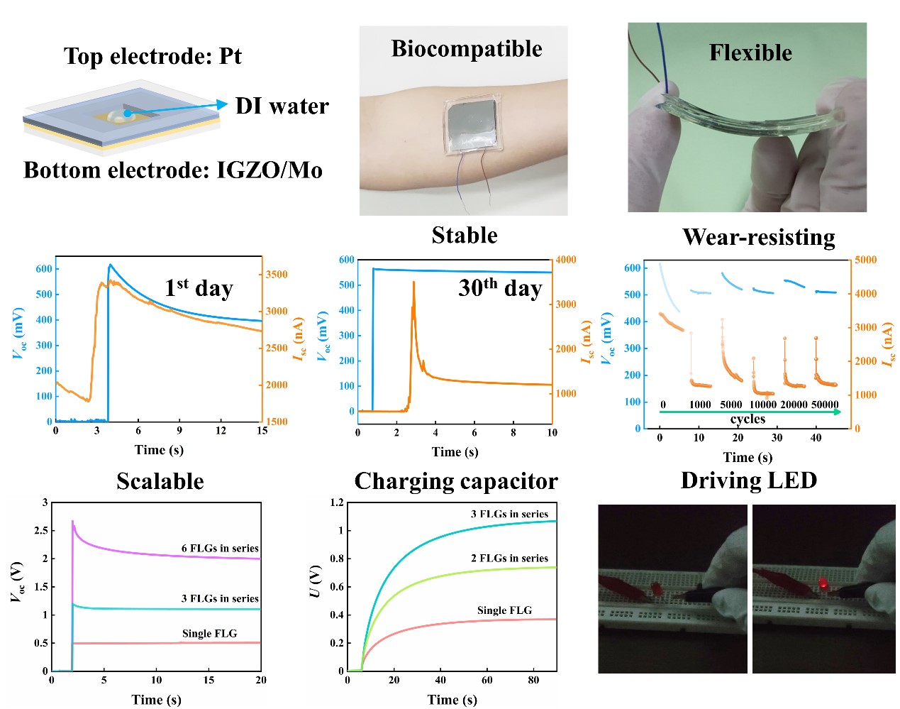 目前柔性可穿戴的应用场景迫切需要柔性直流发电机。传统的刚性接触分离型直流发电机通常具有不可忽视的摩擦损失,无法长期地维持出色的输出,进而妨碍了其在连续运动场景中的实用性。本工作报道了一种具有金属-液体-半导体堆叠结构的柔性直流摩擦伏特发电机。具有铂-水-铟镓锌氧结构的发电机可提供高达2.3 μA cm-2的峰值短路电流密度、高达620 mV的峰值开路电压和高达0.1 μW cm-2的功率密度。该器件只需要经过轻微震动或摇晃就可以产生持续不断的直流输出,并表现出了优异的环境稳定性和可靠性。这种简单的工作模式可以使得该器件在日常无序的运动场景中稳定地收集能量,从而满足柔性可穿戴的应用场景。通过合理的器件结构及材料设计,还展示了该器件用于自供电多模传感,可以实现压力、位置姿势或温度的多模态检测。这为实现具有智能感知的电子皮肤、人机交互界面及下一代可穿戴电子设备提供了新的设计思路。