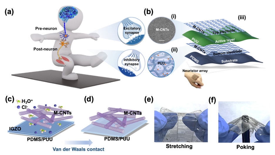人工神经形态器件在神经逻辑和认知功能方面具有重要应用,可广泛应用于神经康复、人机交互和智能机器人等领域。赋予神经形态器件软性和可拉伸性的特性,使其能够适应各种不可预测的变形情况,还能够提高信号采集的准确性和佩戴的舒适性。然而,这些器件仍然容易受到严重的机械损伤(如穿刺、撕裂和切割),严重限制了它们在实际应用中的可靠性和寿命。因此,理想的可拉伸人工神经形态器件还应具备自愈能力,以在经历机械损伤后恢复其结构和性能。此外,在生物神经系统中,同一神经元的突触在相同刺激下可以表现出相反的可塑性形式,以支持一系列复杂神经功能。然而,目前可拉伸的神经形态器件仅能实现基本的单突触行为,无法满足复杂神经系统的需求。
