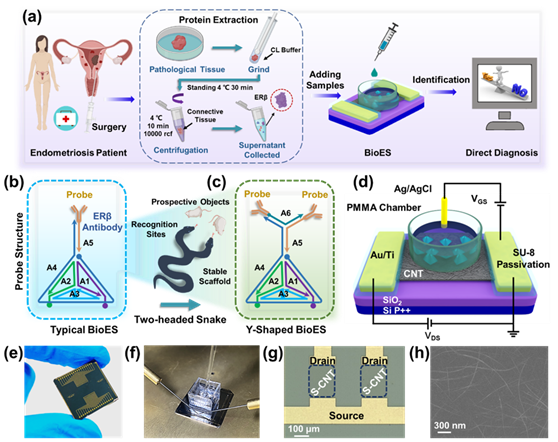 受到自然界生物的启发,本研究模仿双头蛇特征开发了一种生物分子诱捕系统(Biomolecular Entrapment System, BioES)。该系统由碳纳米管晶体管、四面体DNA纳米结构、Y形核酸悬臂和具有生物识别能力的结合位点组成,具有强大的生物分子捕获能力。基于BioES,本研究实现了对子宫内膜异位症生物标志物ERβ的超灵敏定量,检测限可低至6.74 aM。通过核酸架构工程,本研究探索了不同BioES构型对ERβ识别的机制。在临床实验中,BioES表现出对子宫内膜异位症患者和卵巢囊肿患者具有明显的响应区分度。该系统为子宫内膜异位症的标准化诊断方案开辟了新的途径。