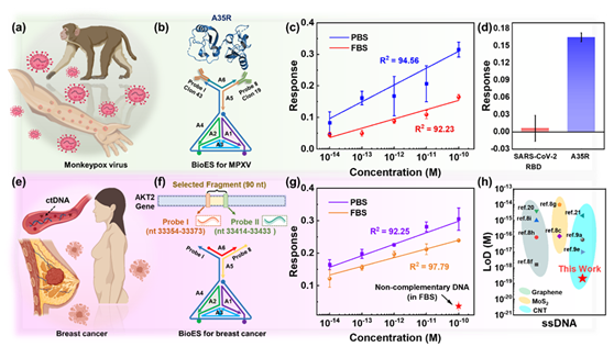 此外,研究将BioES平台从多体进化为多位点模式,通过在不同的识别位点修饰两种抗体Clon 19和Clon 43,首次实现了对猴痘病毒抗原蛋白A35R的超灵敏检测。双重识别位点的协同作用和增强的识别效率使得BioES能够在血清中特异性地识别A35R,检测限降低至991 aM。此外,研究展示了多位点BioES在核酸检测和早期癌症筛查中的实际应用。通过对核酸结合位点的修饰,BioES能够以低至0.21 aM的检测限在血清中捕获与三阴性乳腺癌相关的循环肿瘤DNA(ctDNA)。BioES的研究不仅为临床医学领域带来了重要进展,同时也为全球公共卫生领域的流行病监测和疾病防控提供了新的工具和方法。