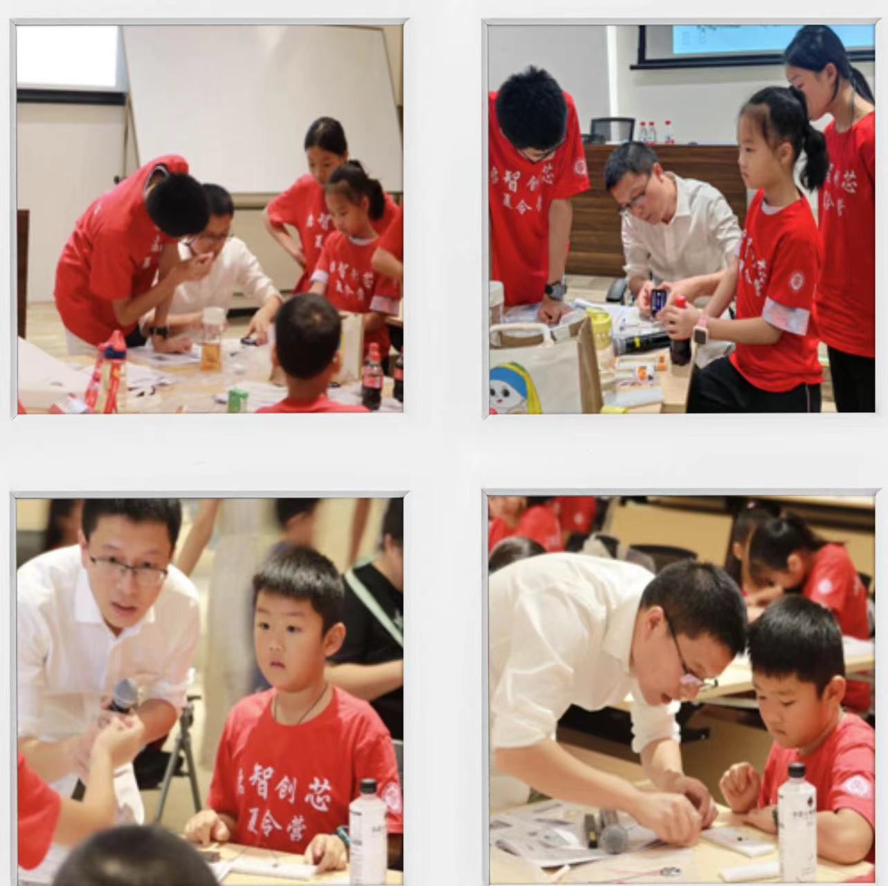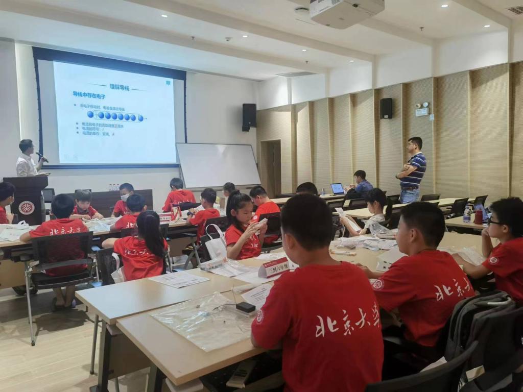 7月21日主讲人是廖聪维博士,北京大学深圳研究生院助理研究员,信息教工支部宣传委员,博士毕业于北京大学。廖老师的主要研究方向是显示驱动集成电路,研究成果获得教育部技术发明一等奖1次,广东省技术发明奖二等奖1次,深圳市技术发明一等奖2次。廖聪维博士以“什么是电流”为话题,用生动的水流类比来解释电流的概念。随后,廖老师又介绍了电压和电阻,并讲解了电子技术的基本原理和常见元件的功能,重点介绍了555集成芯片。在此过程中,廖老师与学员们进行了互动,激发了学员们的学习兴趣。在廖老师的指导下,学员们独立完成了让LED点亮和让喇叭发声的两个任务,亲手感受到了电子技术的神奇之处。随后是基于NE555的LED调制实验和电子琴制作实验,学员们先进行小组内的讨论,并制定小组展示方案,充分发挥了团队合作的优势。