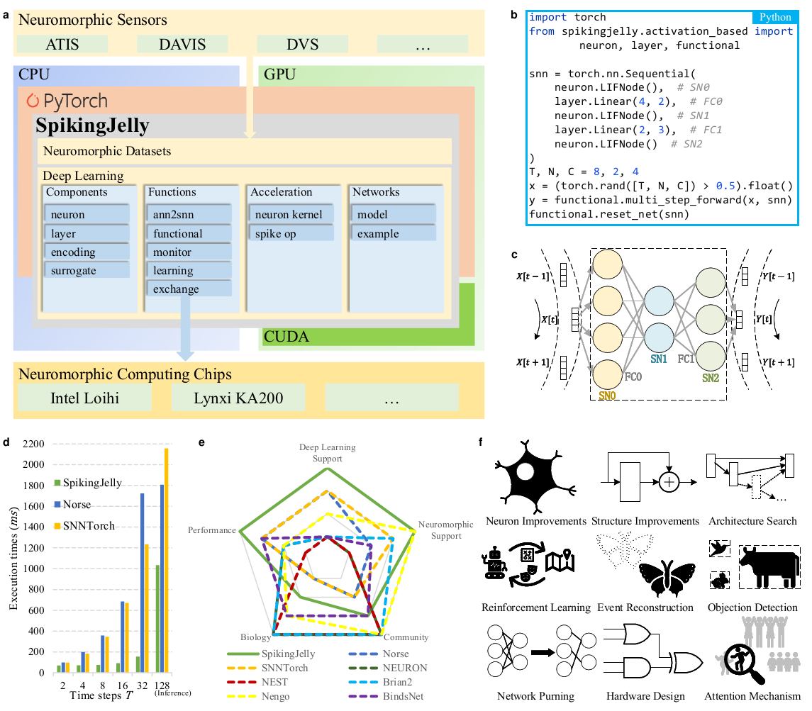 图1:SpikingJelly(惊蜇)框架的整体结构、示例代码、仿真速度、生态位以及典型应用