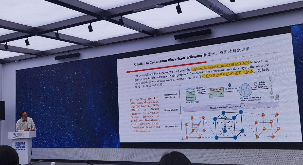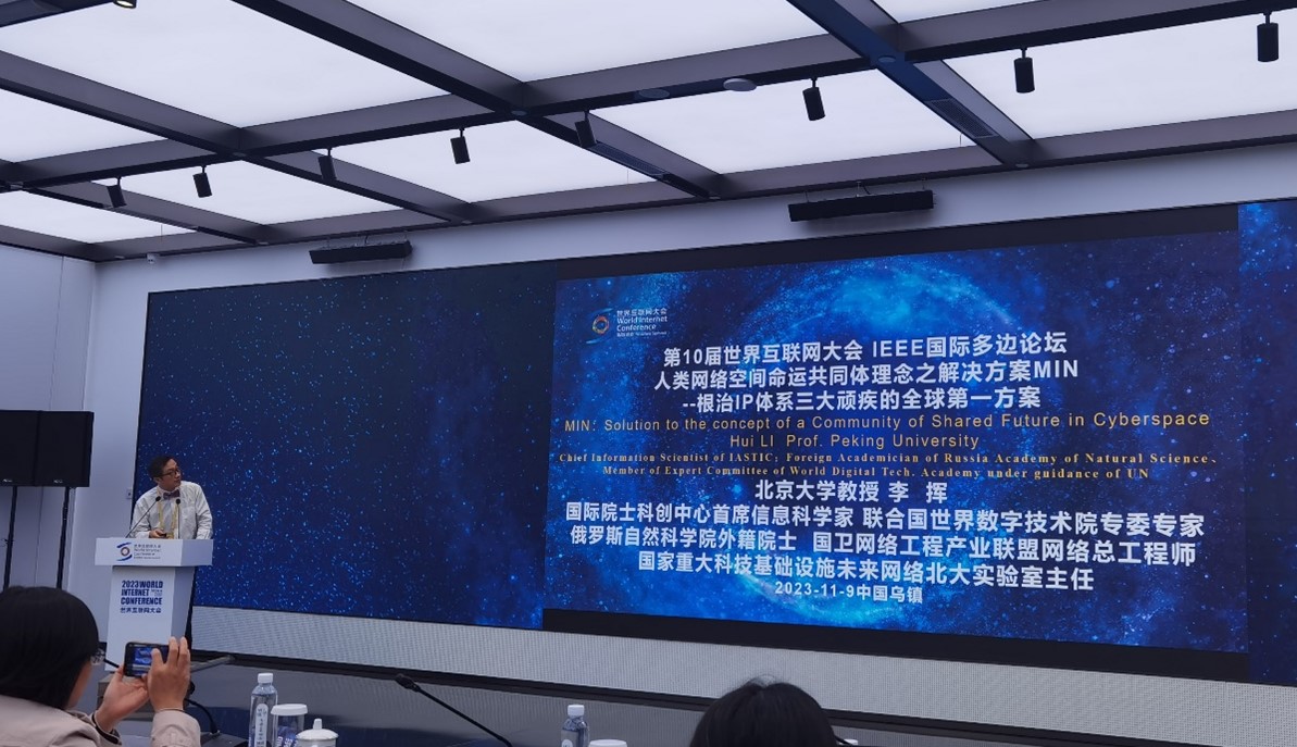 李挥教授的演讲主题为《人类网络空间命运共同体理念之解决方案MIN---根治IP体系三大顽疾的全球第一方案》。他指出,IP网络三大致命缺陷,一是网络空间被独家垄断,二是没有安全基因事故层出不穷,三是架构僵化演进升级成本巨大。习近平主席2015代表中国政府在全球首次提出人类网络空间命运共同体的理念,得到普遍认可,研究团队在全球首次提出了多边共管多标识网络体系MIN及原型。