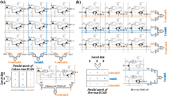 图5. 提出的11T SRAM单元的CAM工作模式 (a) 并行列向BCAM搜索与列向TCAM单元 (b)并行行向搜索与行向TCAM单元。