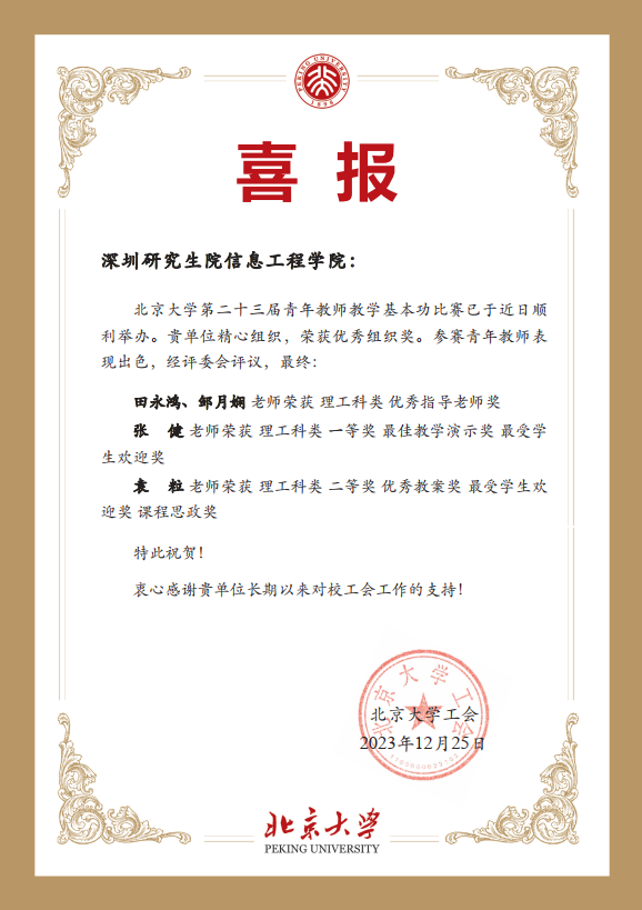 北京大学第二十三届青年教师教学基本功比赛获奖名单日前揭晓,pc28开奖预测参赛青年教师凭借扎实的功底和精彩的表现获得多项佳绩。pc28开奖预测荣获优秀组织奖,张健老师荣获理工科类一等奖、最佳教学演示奖和最受学生欢迎奖,袁粒老师荣获理工科类二等奖,优秀教案奖和课程思政奖,田永鸿、邹月娴老师荣获优秀指导老师奖。祝贺他们!