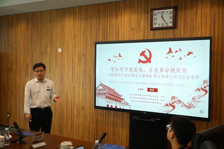 随后,北京大学团委博士生讲师团成员喻伟以“学知明守筑底线,自我革命跳周期”为主题,对《中国共产党纪律处分条例》进行了全面而深刻的剖析,不仅梳理了《条例》的修订历程与背景,还突出了修订后的关键变化及其对党的建设的重大意义。喻伟强调,党纪学习绝非纸上谈兵,而是要“原原本本学,联系实际学”,让《条例》的精神内化于心、外化于行,形成自觉遵守党纪的良好习惯。他的讲解凸显了党纪教育的实效性和紧迫性,通过学习在场的每一位党员都深刻认识到了党纪的严肃性,纷纷表示将在日后的学习和工作中在行动上做到自律自省,为构建风清气正的政治生态贡献力量。
