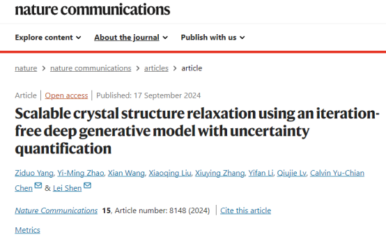 相关成果以“Scalable crystal structure relaxation using an iteration-free deep generative model with uncertainty quantification”为题,发表于Nature Communications。北京大学深圳研究生院研究员、科学智能(AI for Science,AI4S)中心主任陈语谦与新加坡国立大学Lei Shen教授为共同通讯作者;中山大学博士生、北京大学深圳研究生院研究助理杨梓铎与新加坡国立大学博士生赵艺明为共同第一作者。