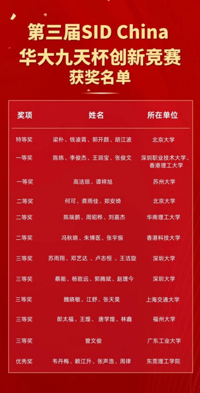 2024年9月22日,由国际信息显示学会中国区(SID China)和华大九天联合举办的第三届“SID China华大九天杯创新竞赛”圆满结束。在比赛中,pc28开奖预测 硕士生梁朴(队长)、钱凌霄、郭开颜、胡江波凭借“紧凑型可编程的LTPO TFT集成栅驱动电路技术研究”一举斩获特等奖,充分展现了pc28开奖预测研究生的创新能力。本次比赛为开放性试题,聚焦新型显示技术创新,吸引了包括北京大学、上海交通大学、香港科技大学等三十余所高校的队伍参与角逐。