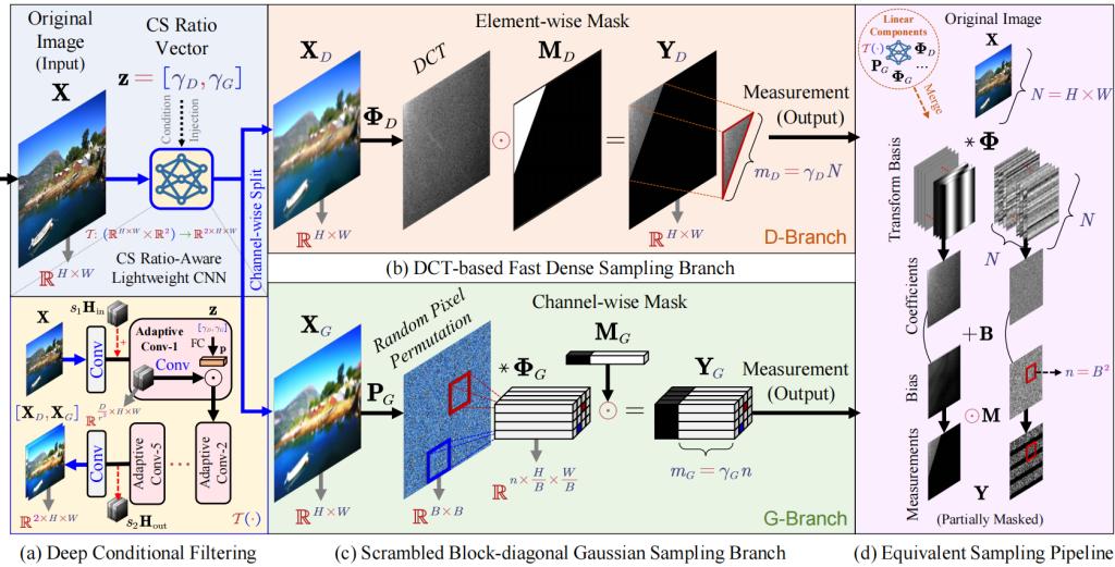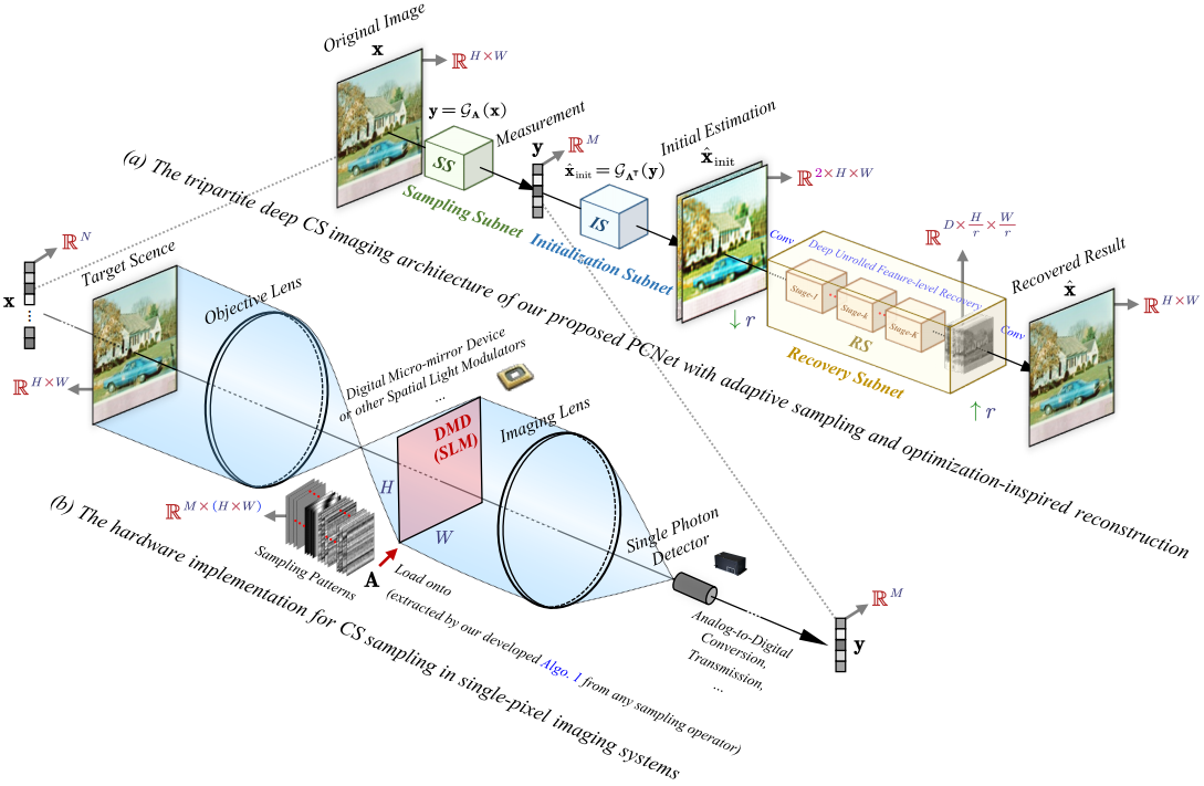 图像压缩感知(Compressed Sensing,CS)旨在从少量线性观测值中重建原始图像信号,以突破奈奎斯特采样极限、极大地降低信号获取成本,其应用包括但不限于单像素相机、医疗成像(如CT和MRI)以及视频快照和光谱压缩成像等。目前,CS面临两个具有挑战性的问题:(1)如何设计高效的采样矩阵和采样方式,以尽可能多地保留图像信息;(2)如何设计高效的重建算法,以快速、精确地复原图像信号。课题组针对这两个问题,提出一种实用的紧凑深度压缩感知算法,相关成果发表在TPAMI上(论文地址://ieeexplore.ieee.org/document/10763443)。