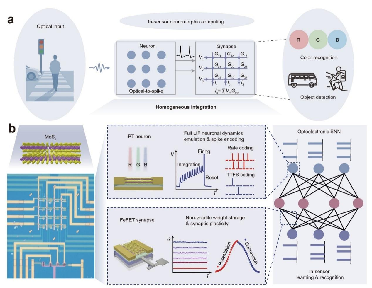 随着智能感知与边缘计算的快速发展,传统基于CMOS传感器的视觉系统在处理效率与能耗方面面临严峻挑战。现有架构中,感知、存储与计算单元彼此分离,数据频繁搬移,导致系统复杂度提升,延迟与功耗显著增加。为突破这一瓶颈,视觉神经形态计算架构逐渐兴起,其核心是在传感器层面融合光学感知与初步处理功能,实现输入数据的本地实时预处理。其中,神经元与突触器件是实现信息编码、权重调控与计算的关键单元。在基于脉冲神经网络(SNN)的框架下,泄漏-积分-发放(LIF)神经元因硬件兼容性强、支持稀疏事件驱动编码而备受关注。然而,现有光电LIF神经元受限于结构与材料体系,难以充分模拟生物神经元的动态行为。同时,神经元器件通常需要具备易失性的短时动态响应特性,而突触器件则强调非易失性权重存储功能,两类器件在材料与工艺层面的兼容性不足,进一步增加了系统集成难度,成为制约高效神经形态视觉系统发展的关键瓶颈。