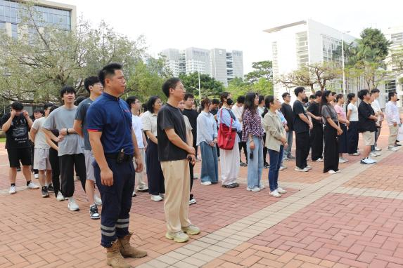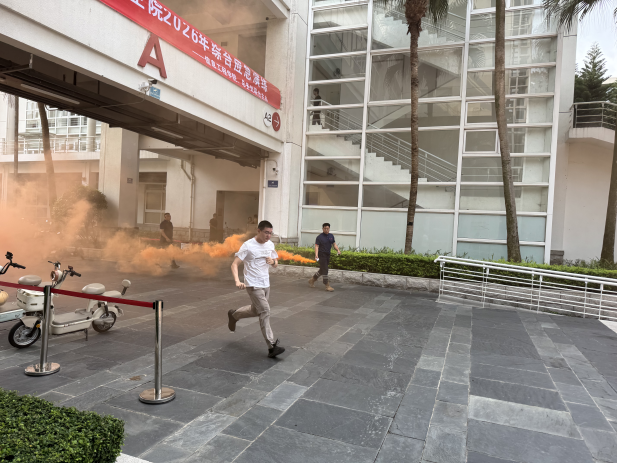 上午9时,参演师生在A栋前榕树广场集合,演练正式拉开帷幕。现场准备就绪后,张伟滨老师宣布“北京大学深圳研究生院2026年综合应急演练现在开始”。各环节依次展开,整场演练按照真实应急流程有序推进。