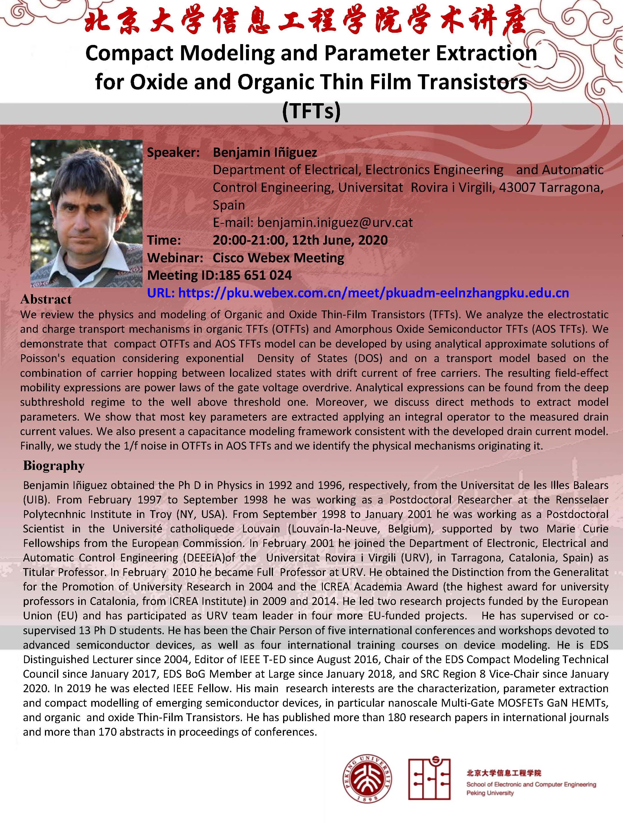 【学术讲座】Dr.Benjamin(UIB):Compact Modeling and Parameter Extraction for Oxide and Organic Thin Film Transistors