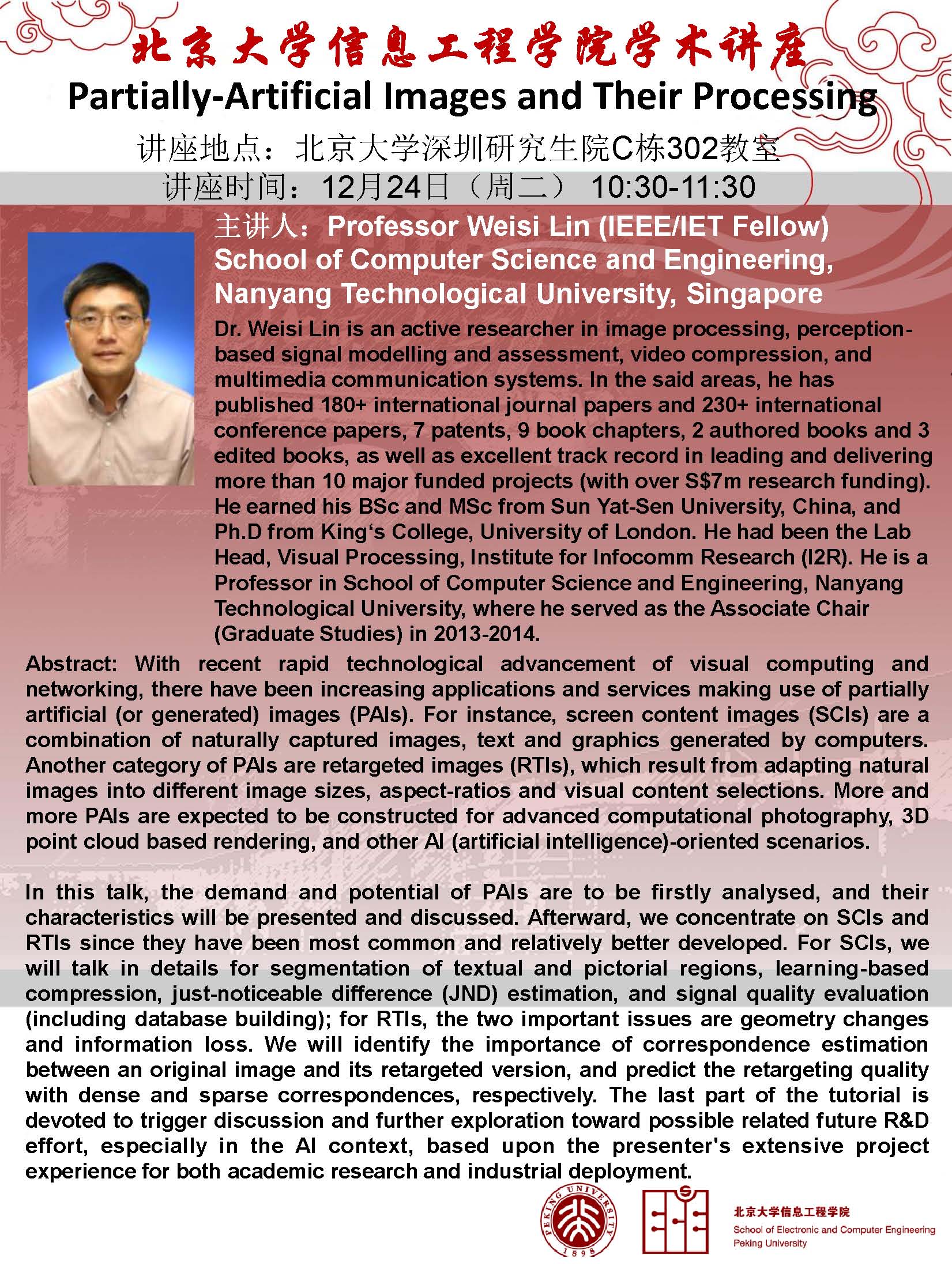 【学术讲座】Weisi Lin教授(新加坡南洋理工大学):Partially-Artificial Images and Their Processing
