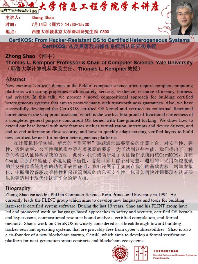 【学术讲座】邵中教授(耶鲁大学) CertiKOS: 从反黑客攻击操作系统到认证异构系统