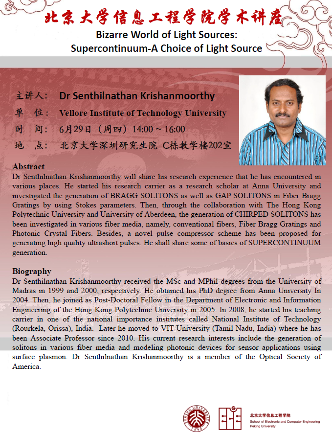 【学术讲座】Dr Senthilnathan Krishanmoorthy:Bizarre World of Light Sources: Supercontinuum-A Choice of Light Source