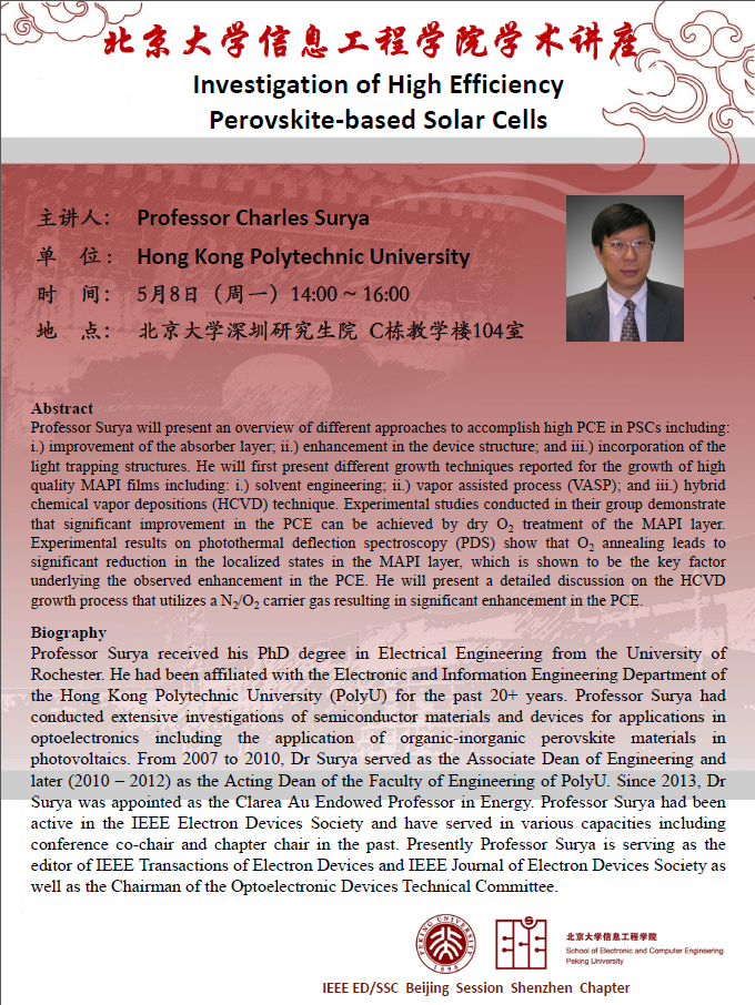 【学术讲座】Prof. Charles Surya(Hong Kong Polytechnic University):Investigation of High Efficiency Perovskite-based Solar Cells