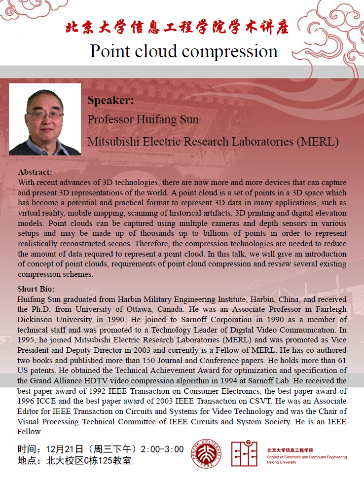【学术讲座】Professor HuifangSun MitsubishiElectricResearchLaboratories(MERL):Point cloud compression
