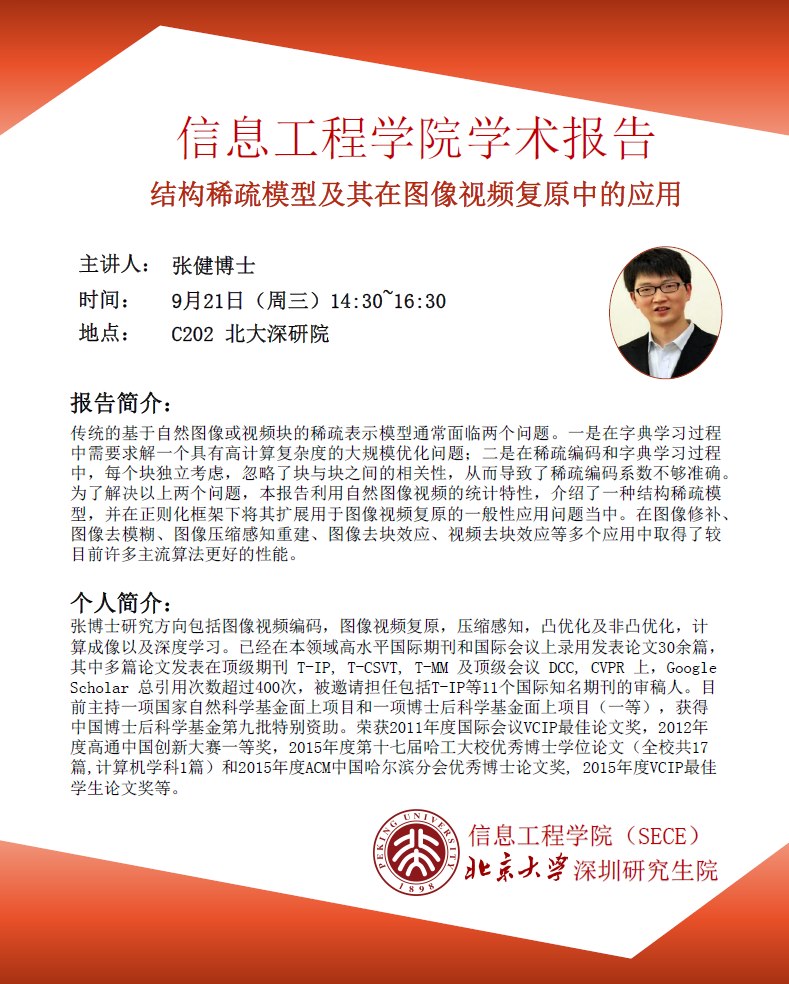 【学术讲座】 张健博士 (哈工大本硕博,北京大学博士后):结构稀疏模型及其在图像视频复原中的应用