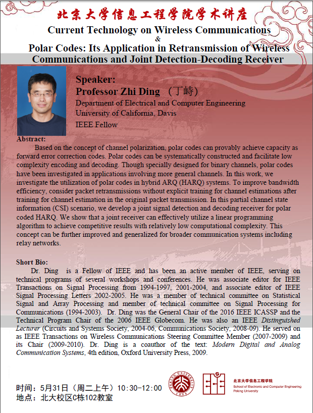 【学术讲座】Professor Zhi Ding (IEEE Fellow) : Current Technology on Wireless Communications & Polar Codes:Its Application in Retransmission