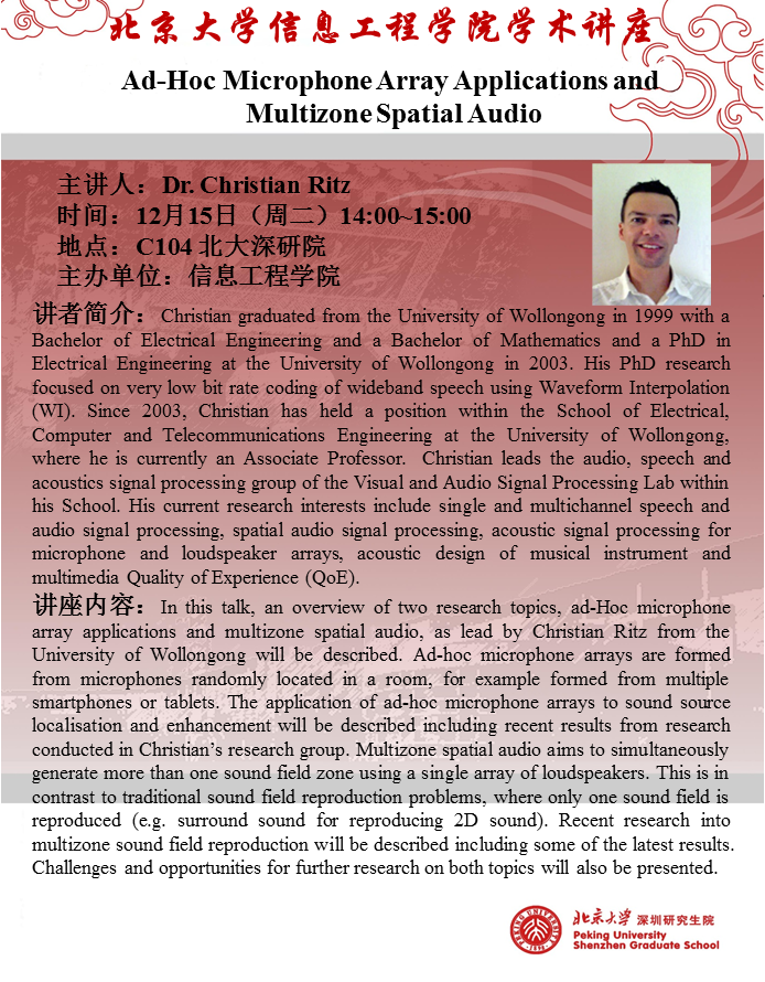 【学术讲座】DR.Christian Ritz(UOW):Ad-Hoc Microphone Array Applications and Multizone Spatial Audio