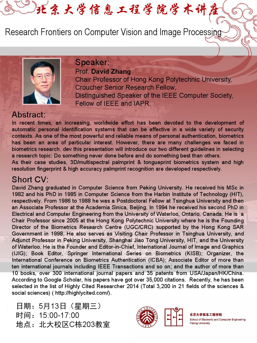 【学术讲座】Prof. David Zhang:Research Frontiers on Computer Vision and Image Processing