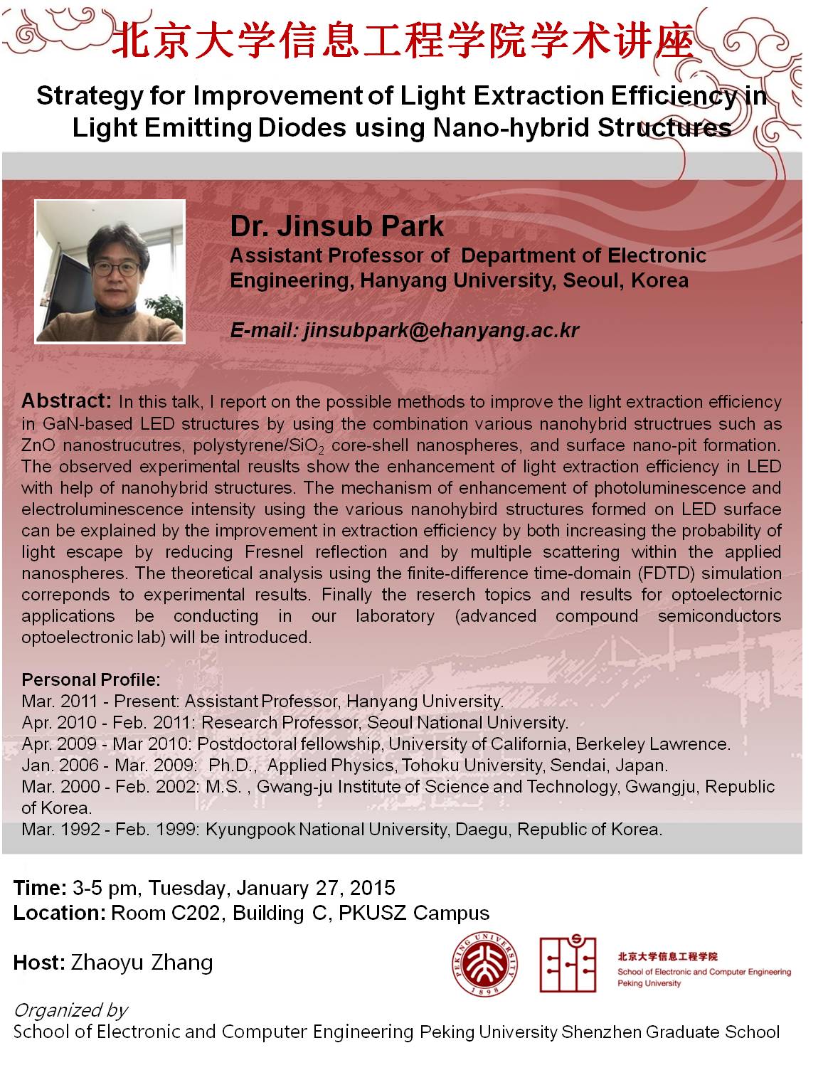 【学术讲座】 Dr. Jinsub Park:Strategy for Improvement of Light Extraction Efficiency in Light Emitting Diodes using Nano-hybrid Structures