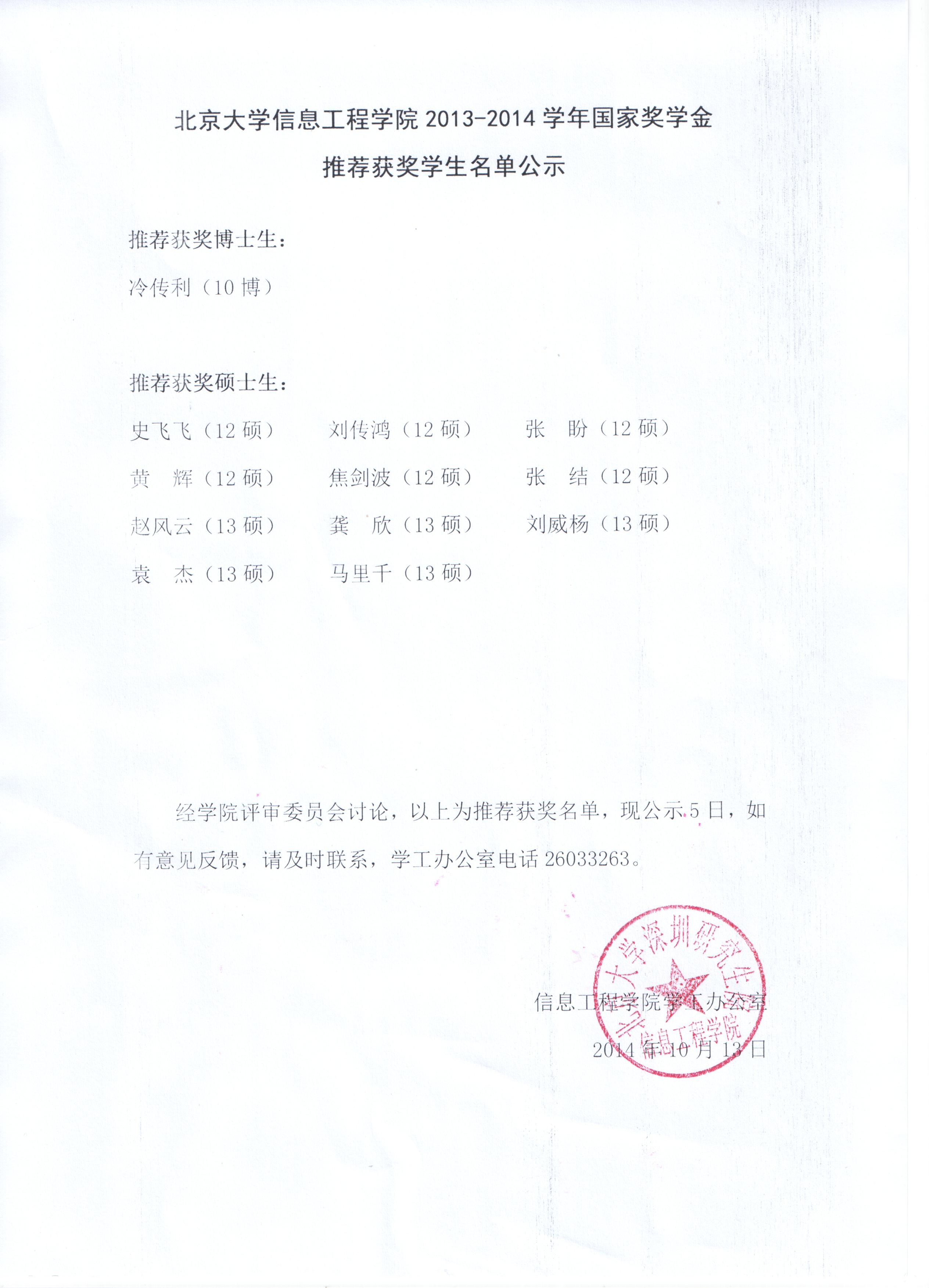 pc28开奖预测 2013-2014学年国家奖学金推荐获奖学生名单公示
