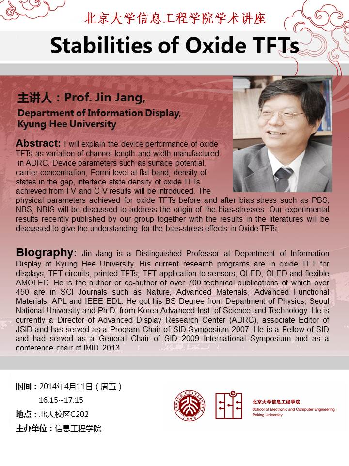 【学术讲座】Prof. Jin Jang( Kyung Hee University):Stabilities of Oxide TFTs