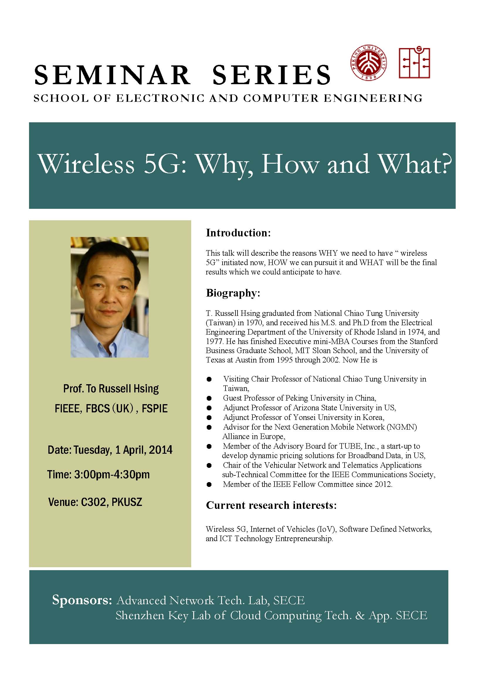 【学术讲座】Prof.Russell Hsing(香港中文大学):Wireless 5G: Why, How and What?