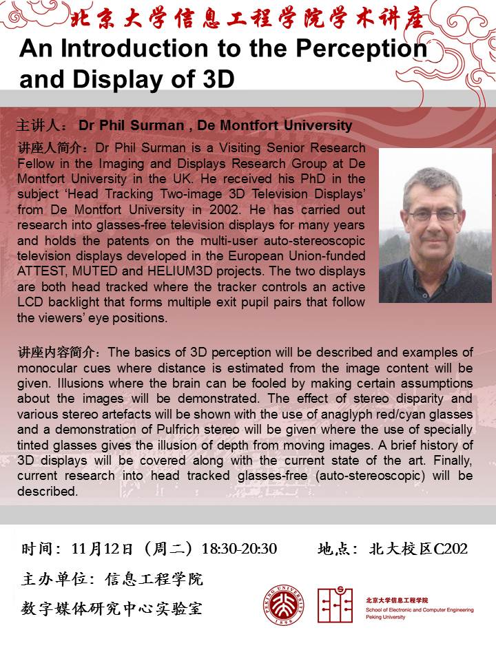 【学术讲座】Dr.Phil Surman(De Montfort University):An Introduction to the Perception and Display of 3D