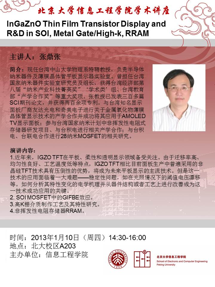 【学术讲座】张鼎张教授:InGaZnO Thin Film Transistor Display and R&D in SOI, Metal Gate/High-k, RRAM