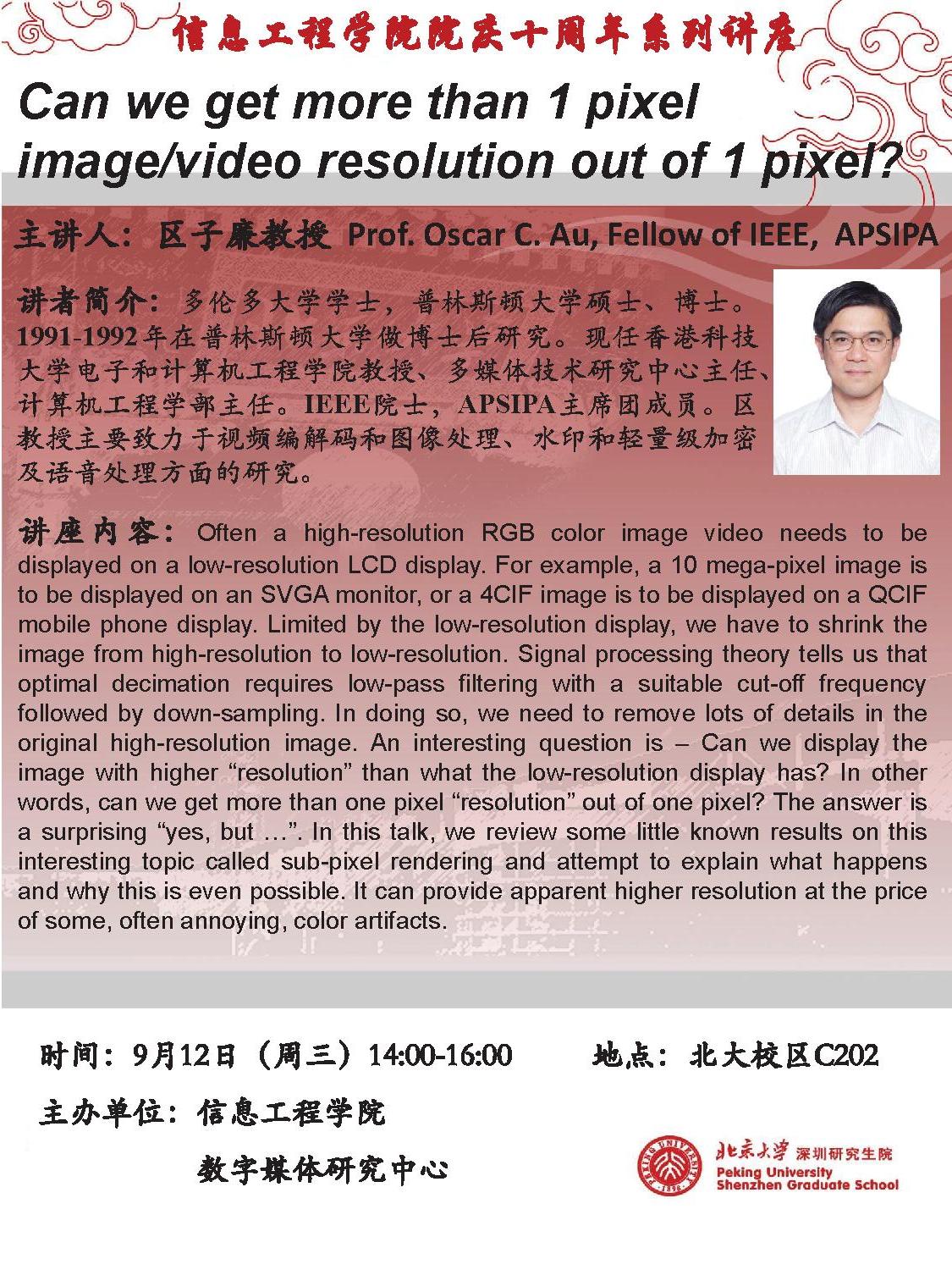 【pc28开奖预测 院庆十周年系列讲座】Prof.Oscar C.Au:Can we get more than 1pixel image/video resolution out of 1 pixel?