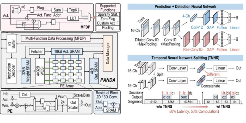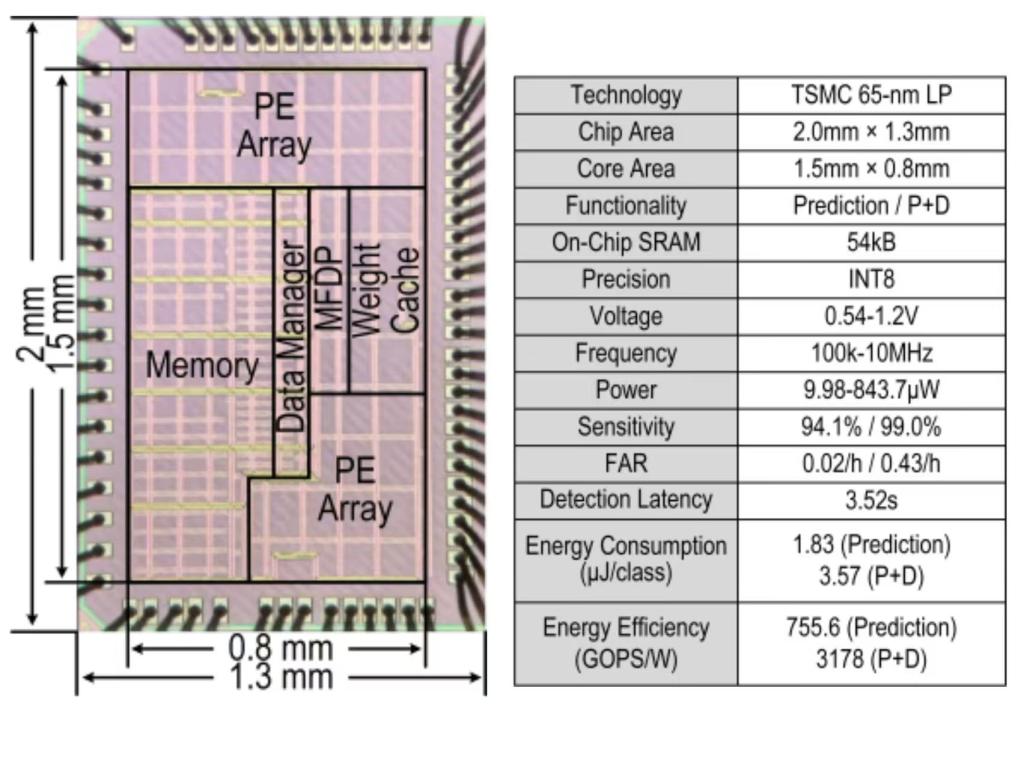癫痫是一种由脑神经元异常放电引发的慢性神经系统疾病,全球患者人数超过6500万。由于癫痫发作具有突发性和不可控性,患者时刻面临着健康风险。可穿戴智能设备对于癫痫患者在非医院环境下的健康监测至关重要。此类设备提供的长期实时癫痫发作监测能显著降低看护成本,同时提升患者的生活质量。此次pc28开奖预测 的研究工作旨在解决当前用于超低功耗可穿戴智能设备的癫痫监测处理器在癫痫识别性能与能耗之间难以兼顾的问题。该研究工作开发了一种可配置的癫痫预测+检测神经网络加速器PANDA。该研究提出了一种轻量级预测+检测癫痫监测框架,在保证高分类性能的同时实现了低计算复杂度。并通过采用时序神经网络分割技术,有效降低了计算延迟与计算量。加速器采用通道优先、输出固定数据流架构,结合激活值跳零技术和通过统计信息优化的权重缓存,显著提升了加速器的能效。此外,通过自定义指令集设计,该加速器具备高度可配置性,可灵活支持不同神经网络的部署。该工作采用了65纳米工艺进行了流片验证。在癫痫监测任务中,芯片实现99%的灵敏度、0.43次/小时的误报率,以及最高3.178TOPS/W的能效表现,达到国际领先水平。